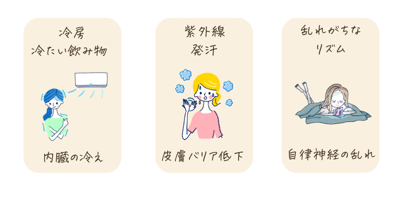 - 冷房や冷たい飲み物 → 内臓が冷える