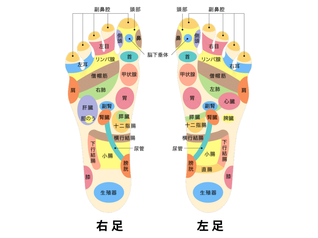 足裏には「反射区」と呼ばれる、臓器や器官とつながるゾーンがあります。